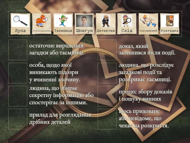 Детектив - людина, що розслідує загадкові події та розкриває таємниці., Розслідування - процес збору доказів і пошуку винних , Таємниця - щось приховане або невідоме, що чекає на розкриття., Слід - доказ, який залишився після події., Підозрюваний - особа, щодо якої виникають підозри у вчиненні злочину., Шпигун - людина, що збирає секретну інформацію або спостерігає за іншими., Розгадка - остаточне вирішення загадки або таємниці., Лупа - прилад для розглядання дрібних деталей ,