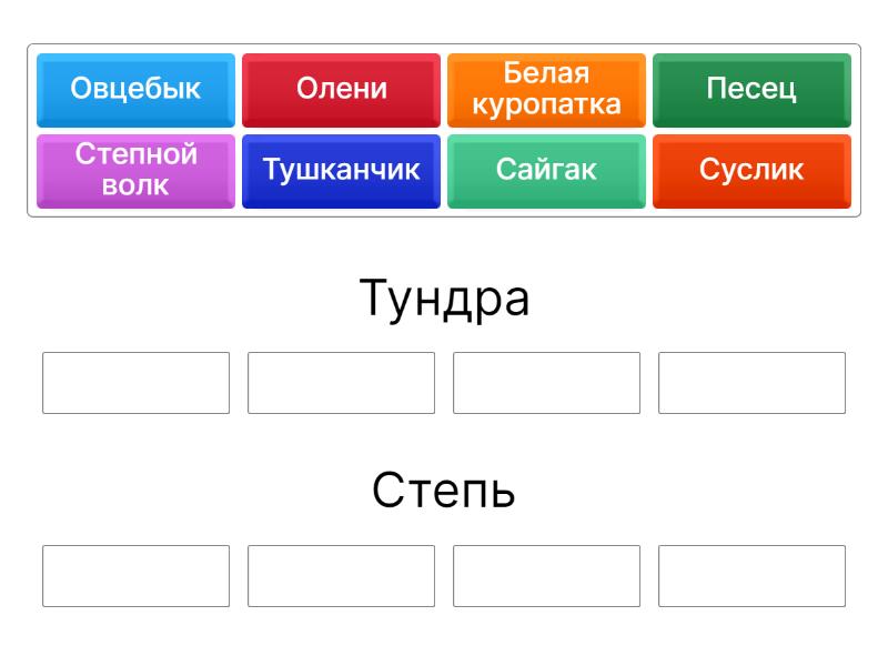 Тундра: Олени, Песец, Овцебык, Белая куропатка, Степь: Тушканчик, Степной волк, Суслик, Сайгак,