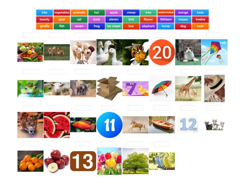 flower, kite, dog, tree, elephant, boat, ice cream, hat, cat, box, watermelon, umbrella, vegetables, mouse, orange, goat, fish, giraffe, apple, frog, duck, bees, sheep, bird, horse, thirteen, twenty, eleven, twelve, seven,
