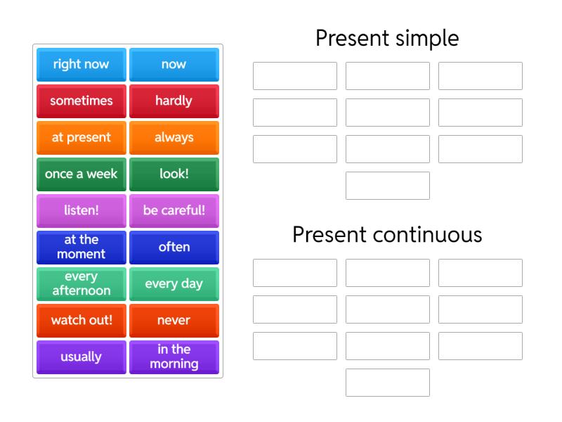 Present simple: always, often, usually, sometimes, hardly, never, once a week, every day, every afternoon, in the morning, Present continuous: now, right now, at the moment, at present, look!, listen!, watch out!, be careful!,