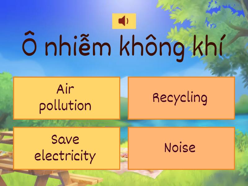 1) Ô nhiễm không khí a) Air pollution  b) Recycling c) Save electricity  d) Noise  2) Tái chế a) Throw away trash b) Recycle  c) Waste water d) Damage  3) Tiết kiệm điện a) Throw trash  b) Save electricity  c) Cut down trees d) Pollute the air  4) Ô nhiễm tiếng ồn a) Water pollution b) Air pollution c) Noise pollution  d) Land pollution 5) Sử dụng lại (chai, túi, hộp…) a) Reduce  b) Reuse  c) Waste  d) Damage